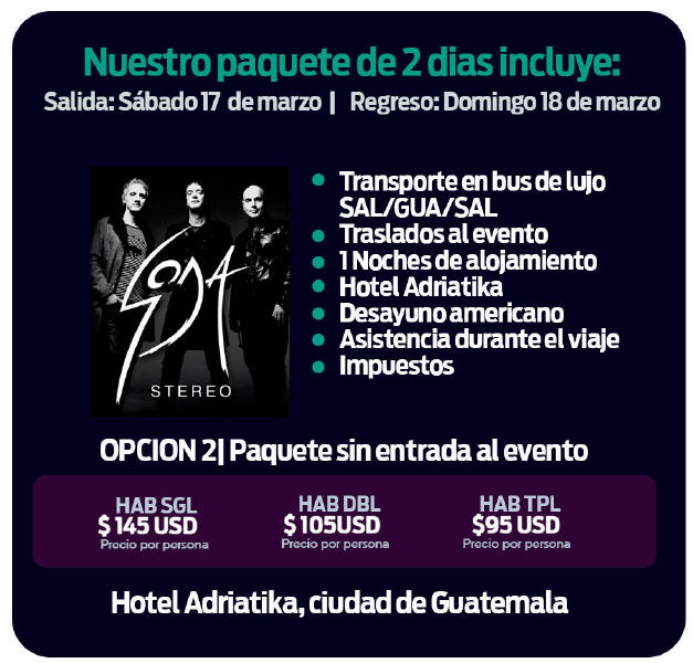 Si ya compraste tu entrada, Linea Ejecutiva te ofrece una opción de 2 días que incluye; transportes de lujo, alojamiento, desayuno y asistencia ( no incluye entrada ). Somos su mejor opción para disfrutar este espectacular concierto de la mejor forma!!!