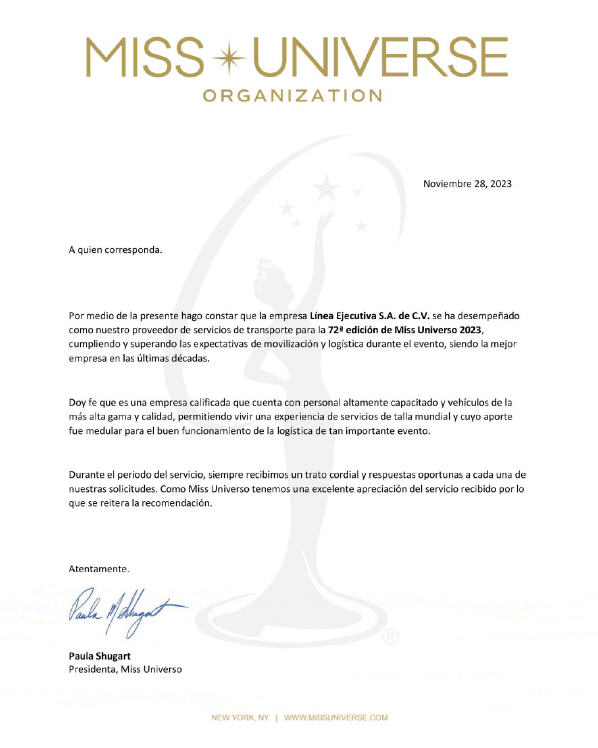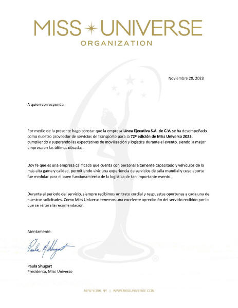 La presidenta de la Organización Miss Universo en ese momento, Paula Shugart, expresó su plena satisfacción con nuestros servicios y, mediante una carta de recomendación, destacó que el transporte brindado en El Salvador fue el mejor que habían recibido en los 23 años de su gestión al frente del certamen.