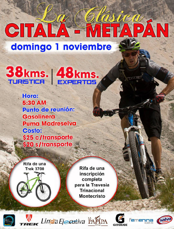 Nuevamente la aventura, la emoción y la adrenalina se hacen presentes en la Clásica de MTB "Citalá-Metapán" Serán 48 kms. para expertos y para los no tan expertos, hemos trazado una ruta turística de 38 Kms.